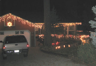 In the city we put up white icicle lights to emulate snow and added the twinkling fake deer on our front lawn to bring us that country feel. We always got an over priced, cut tree, from a lot or a cheap one in front of Wally World. Once I moved to the mountains I thought things would be different. We have lots of real snow, too many real deer and are surrounded by more trees than you can imagine. Guess what? They do more lights and fake deer up here than the city. Get this, the trees cost the same and this is where they cut them. I find that very surprising and funny. I have two perfect Christmas trees in my yard that are better than what we bought.